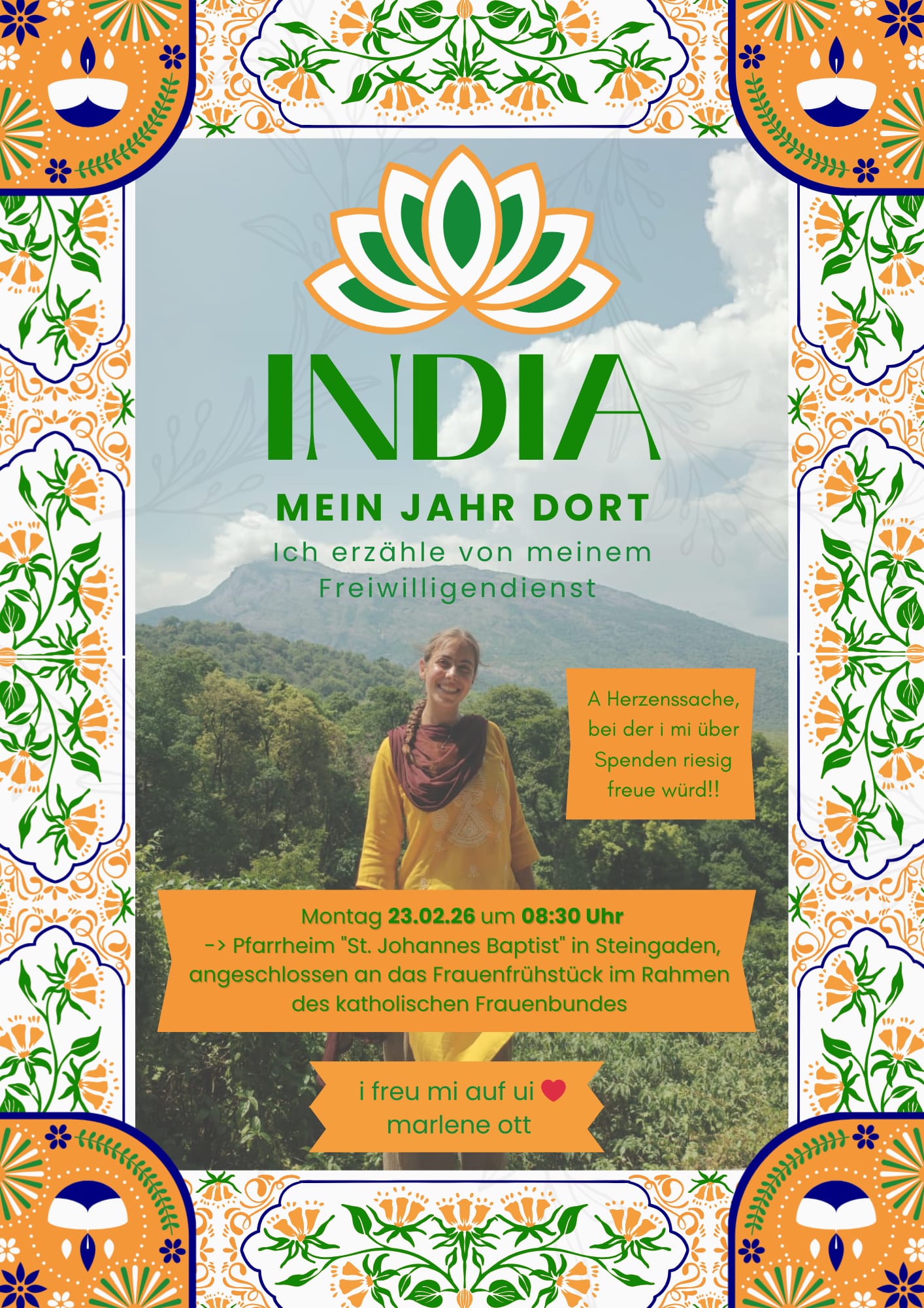 Beginn um 8.30 Uhr mit dem gemeinsamen Frühstück. Anschließend Vortrag mit Marlene Ott / Berghof-Halblech "India" Mein Jahr dort -Ich erzähle von meinem Freiwilligendienst"